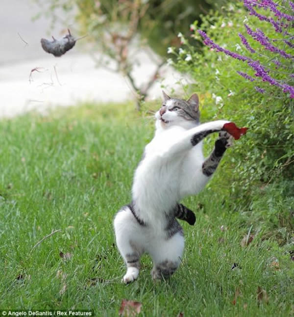 最初,德桑蒂斯还以为“德克斯特”在玩一片树叶,走近一看,才发现是老鼠。他随后拿起照相机,拍摄下这难得一见的精彩瞬间。他说:“‘德克斯特’把老鼠当成了填充玩具,尽情戏耍。我很幸运,捕捉下‘德克斯特’将老鼠抛向半空的瞬间。可怜的老鼠完全被‘德克斯特’掌控,做出各种好似杂技演员一样的动作。”