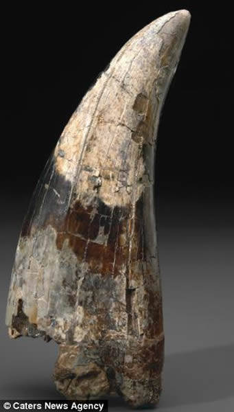 据英国《每日邮报》报道,美国一位农民最近在自家农田里发现了一颗距今6700万年的霸王龙牙齿。这颗牙齿12月11日将出现在洛杉矶的拍卖会上,预期其拍卖价格将达1.9万英镑。