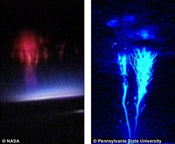 红色精灵闪光(左)和蓝色精灵闪光是在地球上只能持续十分之一秒的闪电