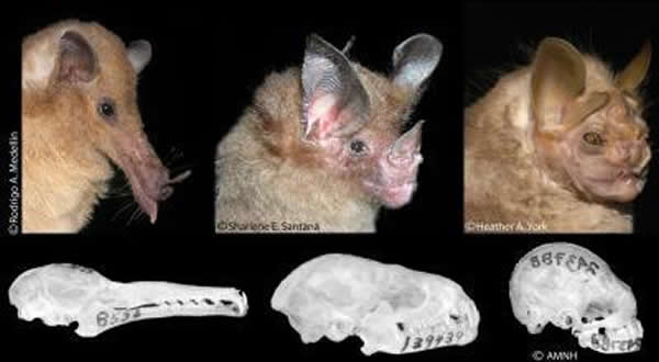 为什么随着进化的进行,一些类群可以分异出许多属种而另一些却极少?这一长期困扰进化学家的问题,日前由来自马萨诸塞大学安默斯特校区的Elizabeth Dumont、纽约州立大学石溪分校的Liliana Dávalos,以及柏林莱布尼兹动物园与野生生物研究所和加利福尼亚大学洛杉矶分校的研究者进行了解答。他们综合研究了一科现代蝙蝠内的食谱、咬合力和头骨形状,并利用现代统计学工具进行分析,记录了其特征和属种数随时间的变化,从而回答了前述问题。现代叶鼻蝠(New World Leaf-Nosed bats)科内有近200个种,而相同时间内它们的亲属却仅进化出10种。与绝大多数以昆虫为食不同,叶鼻蝠以花蜜、水果、蛙类、蜥蜴,甚至吸血为食。