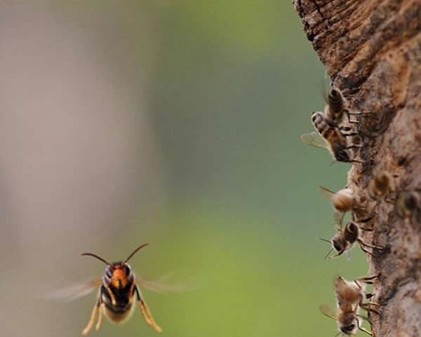 一只胡蜂在树洞口外"抓捕"回家的野生蜜蜂。
