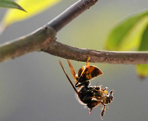 一只与同类打斗后精疲力竭的胡蜂,在抓捕野生蜜蜂时反因体力不支被蜜蜂“群殴”死去。