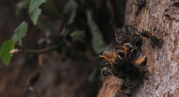 2011年初冬时节,生活在成都市区内一株老茶树树洞里的野生蜜蜂与它们的天敌胡蜂天天上演着一场场生死大战。记者用镜头拍下了这群野生蜜蜂为了生存抗争胡蜂、胡蜂间为争夺食源相互打斗以及小蜜蜂以弱胜强的一个个瞬间。