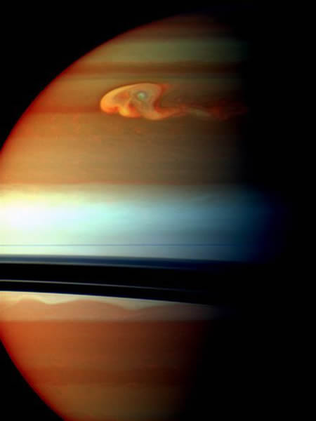 这是一幅伪色图片,由宇航局的“卡西尼”号飞船2010年12月拍摄的3幅近红外照片合成,上周对外公布,展示了土星北部地区出现的壮观风暴。风暴扰乱了原本有序的土星云和星环。红色和橙色区域的云处在土星大气层深处,黄色和绿色区域代表中间云,白色和蓝色区域为高云和薄雾。