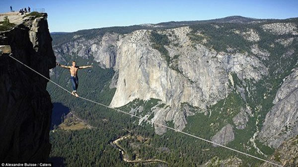 奥地利“钢丝超人”迈克-凯米特近日在加州约塞米蒂国家公园近千米的高空,完成了令人心惊胆战的走绳索表演。