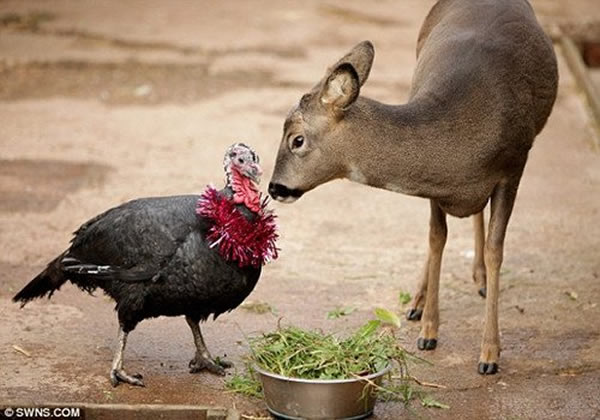 在英国一家野生动物中心,一只名叫丁赛尔的火鸡和一只叫布兰博的小鹿陷入“恋爱”。火鸡每时每刻都黏在小鹿的身边,如果有人想接近小鹿,火鸡就会大叫赶走他。