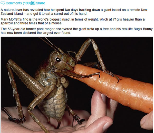 据英国《每日邮报》12月1日报道,新西兰巨沙螽(音同中)是世界上最重的昆虫,一名美国自然爱好者日前在新西兰发现巨沙螽之中的“王者”,其体重比小老鼠重三倍,可以吃胡萝卜。