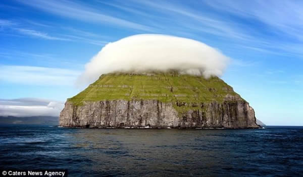 法罗群岛的偏远岛屿拉姆特拉-德姆岛,顶部被一个形状奇特的云朵罩住,好似一个巨型纸托蛋糕
