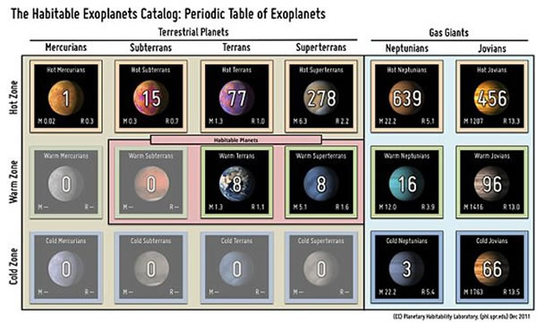 研究人员使用不同分类系统汇编和分类系外行星发现,其中包括行星附录和恒星性质。这项宜居星球索引根据质量和热量将系外行星分成18分类,建立了一个类似元素周期表的系外行星表格。该索引的附录将包括科学直观性和系外行星地图。