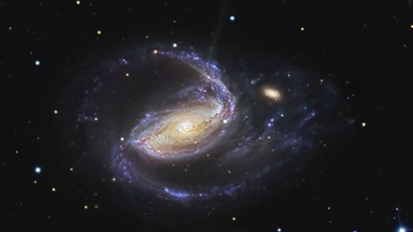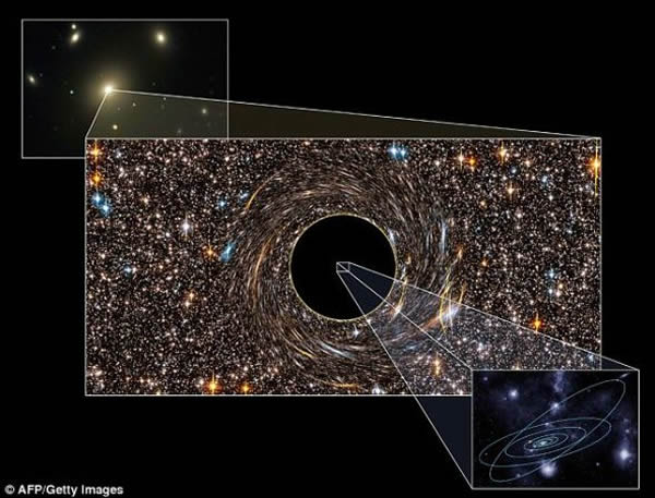 艺术概念图,展示了NGC 3842星系(背景)、影响恒星的黑洞(中)以及我们的太阳系(插图)