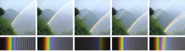 从左至右:弓形主虹、主虹、双彩虹、多重主虹、孪生彩虹