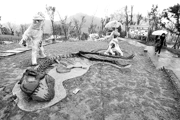 据唐女士所说的方位,昨日下午,记者寻找到了这个“恐龙王国”,果真如同“穿越”到另外一个空间。当然这不是科幻小说再现,而是一个正在低调施工的公园。在小雨中,桃源恐龙科普公园正在进行最后的绿化铺装,颇具规模的仿真史前动物形如一个与世隔绝的世界。