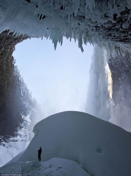 汉默肯瀑布座落于加拿大威尔斯-格雷省立公园,高度达到450英尺,是世界上最令人敬畏的瀑布之一。在冬季温度降至零下时,这个瀑布仍旧是一副奔流不息的景象。它是世界上最难攀登的瀑布之一,同时也是所有攀岩爱好者一心要征服的对象。