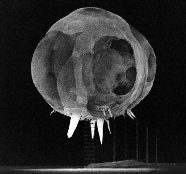 核爆后第1毫秒的影像,此时的冲击波只有20米宽,是在上世纪50年代一次核试验期间拍摄的