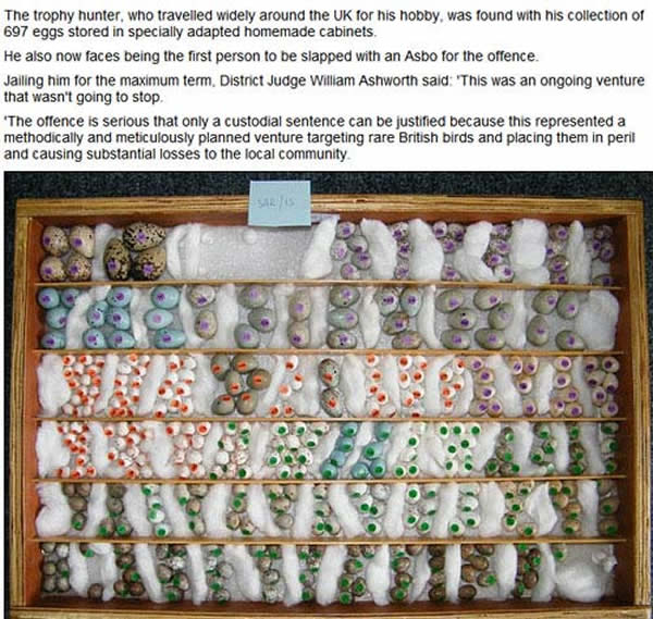 这名“偷蛋狂人”走遍英国,曾向多达170个鸟巢发起过偷袭,对于金鹰和鱼鹰的巢穴,他采取的方式是“连锅端”。他将偷来的697枚鸟蛋收藏在经过改装的橱柜里,被盗的鸟蛋内被认为有许多即将孵化出的雏鸟。在将鸟蛋放入橱柜展示前,刚肖先会将这些小生命扼杀在“摇篮里”。