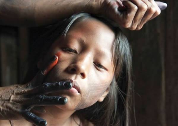 开耶普人会在脸上和身体上涂上染料——主要是黑色或者红色——形成各种图案,有的是几何图案,有的是简单的条纹。这些图案用于显示他们所处的年龄段,同时也用于展示身体的力量,例如肌肉力量、性能力以及感觉能力。照片在库本-康克莱村(Kuben Konkre)拍摄,一位母亲正往女儿脸上涂红色染料。这种染料来自于在森林采摘的乌鲁库(一种果实)的籽。除了涂染料外,开耶普人还会拔掉眉毛和睫毛。女性通常剃掉前额的头发。