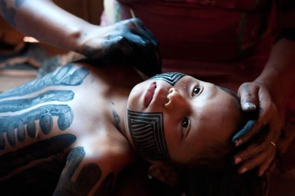 开耶普妇女将格尼帕树的果实与捣碎的木炭混合在一起,制成用于在身体上作画的黑色染料。使用黑色染料在身体上描绘出精巧的几何图案是一个既费时,又费力的过程。米特迈尔的这幅照片在阿克莱村(Aukre)拍摄,展示了一名身上画满黑色图案的男孩。当时,这名男孩的母亲用小木棍在他的身体上描绘出各种图案,整个过程长达几个小时。米特迈尔说:“这个男孩非常听话。”