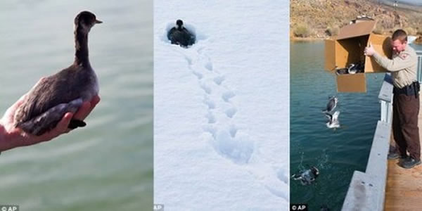 据称,这些水鸟可能因暴风雪天气丧失了方向感,将地面当作水域