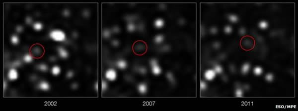 观测显示,这个星云的质量约是地球的3倍,它的位置近年来逐渐靠近“人马座A星”黑洞。这个黑洞的质量约是太阳的400万倍,是距离我们最近的大型黑洞。研究人员分析认为,到2013年,这个星云将离黑洞非常近,有可能被黑洞逐渐吞噬。新华社发(欧洲南方天文台授权提供)