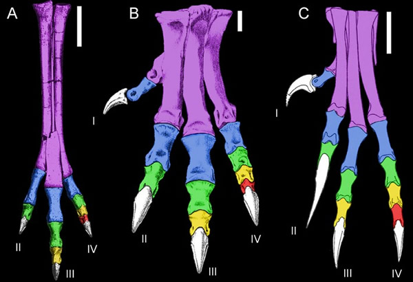 (左)拟鸡龙和中异特龙较长中趾适合跑步,(右)恐爪龙则适合抓握