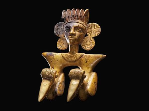 在巴拿马阿尔-卡诺一酋长墓发现的黄金饰品,其中一件为海马造型垂饰
