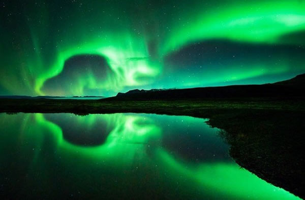 摄影师雷-霍夫曼(Ray Hoffman)于本月初在冰岛Skaftafell国家公园捕捉到了壮观的北极光景象。霍夫曼使用三脚架和30秒的相机曝光,记录下了平静湖面上的极光和其倒影。