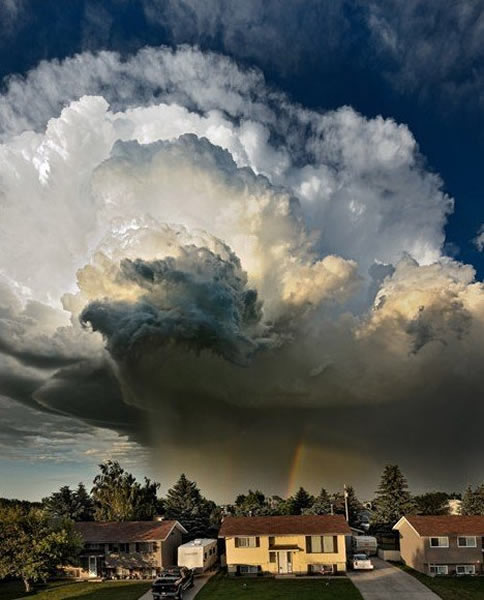 加拿大Taber,在几座家庭住宅的后面,只见风暴云即将形成龙卷风。上个月,帕特-卡瓦纳(Pat Kavanagh )在他家房子的屋顶上拍摄了这一恐怖景象。他说:“在我们国家,很少见到龙卷风,所以这是一个罕见的景象,加上它下面的彩虹,就显得更特别了。”这张照片是由多个垂直全景照片拼接在一起。
