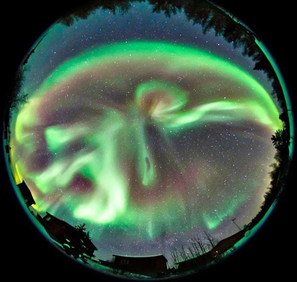 照韩国摄影师Kwon O Chul使用超广角镜头,在加拿大北部小镇耶洛奈夫(Yellowknife)捕获了一个360度极光全景照。他说:“我正在拍摄极光时,突然极光变得非常明亮,整个雪域景观被绿色荧光渲染,就像仙境一般。”