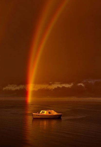 当业余摄影师菲尔-汤普森(Phil Thompson )捕捉到罕见的反射彩虹(reflection rainbow)时,他惊呆了。他沿着澳大利亚Bellarine半岛的码头走着,突然看到一道彩虹由于海水的反射形成了从一点生出的两道彩色弧。当太阳光被雨滴偏转,又被水面反射,就会出现反射彩虹。