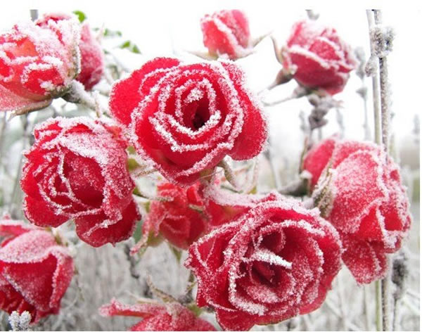 德国法兰克福市的一个小花园,冰霜覆盖在红玫瑰上。