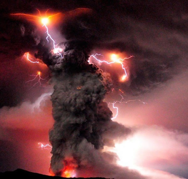 智利南部的火山爆发,火山灰喷发过程中产生了闪电。
