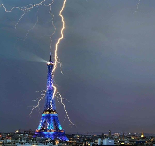 一道闪电击中法国巴黎的艾菲尔铁塔(Eiffel Tower)。
