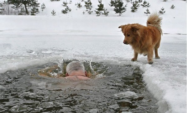 白俄罗斯Viazynka村附近的河结冰了,温度低至零下12摄氏度左右,一只狗正在“观看”Optimalist健康俱乐部的成员在冰水中游泳。
