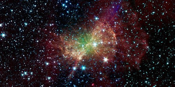 美国宇航局斯皮策太空望远镜拍摄的哑铃星云,该星云喷射大量的红外放射线,该“行星状星云”被死亡恒星内核照亮。