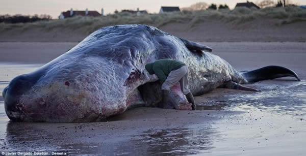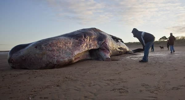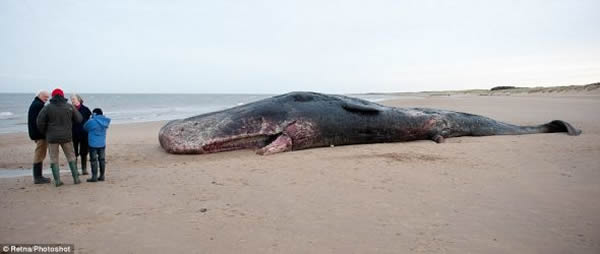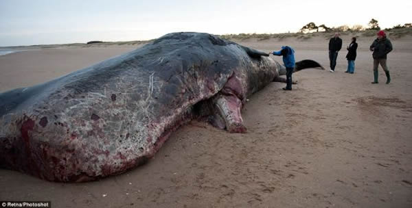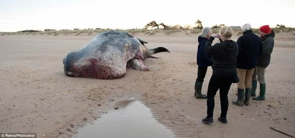 圣诞前夕,一头体长40英尺(12.19米)的抹香鲸被冲上英国诺福克亨斯坦顿海滩,并已死亡,它的胃里显然有一道很大的伤口。它尾部的沙地没有被尾巴扫过的明显痕迹,这表明潮汐在把它冲上岸前,它就已经死了。