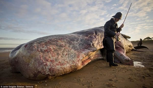 一名男子打扮成渔人模样,假装他捕捉到这头被冲上北海海岸的体长40英尺(12.19米)的抹香鲸