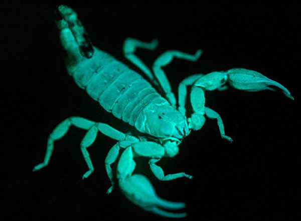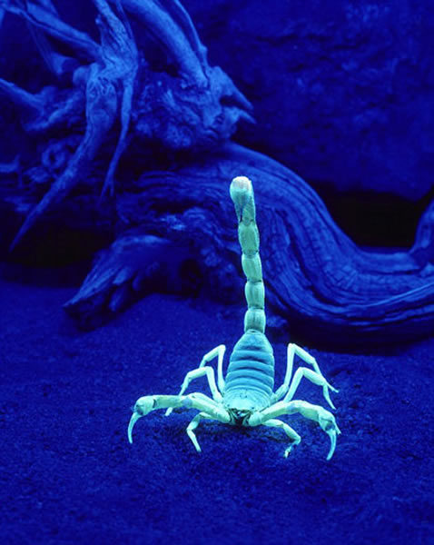 在荧光下的蝎子:奥克拉荷马大学生物学家道格拉斯-加菲恩研究调查这种神秘荧光性,发现蝎子能够使用尾巴探测光线