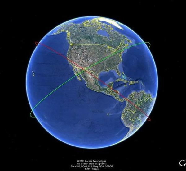 2012年1月初,X-37B太空飞机太空轨道(红线)和中国天宫一号太空轨道(绿色),显示两者的运行轨道非常类似,且存在着交叉点。