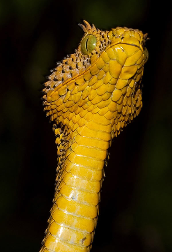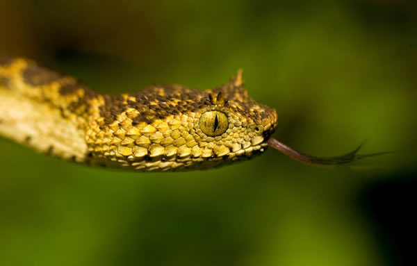生物学家日前在非洲坦桑尼亚的丛林中发现一种体色特殊的新品种毒蛇。从照片可看出,这条毒蛇的皮鳞纹路黄黑相间,而橄榄色的双眼更使牠显得格外凶狠。
