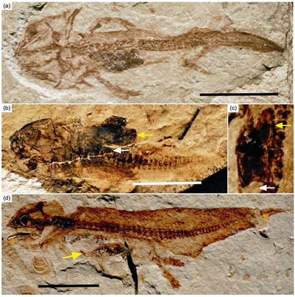 研究人员共发现了11件保存胃中食物的有尾类标本,其中2件为奇异热河螈,腹中保存有大量叶肢介壳体;9件为天义初螈标本,腹中保存不同数目的划蝽。