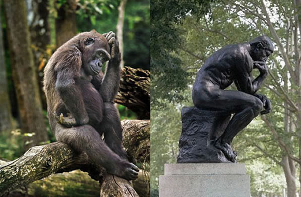 这个青铜大理石的思想者雕像是Auguste Rodin在1902年创作的。自从其它大量的原创作品被创作以来,它经常被用来代表哲学。但是从这只猩猩的角度来看,似乎他正梦想着野外的生活。 索菲说:“很难说它是在思考什么,可能是些深奥的东西,或者它只是在思考厌倦和自由。”