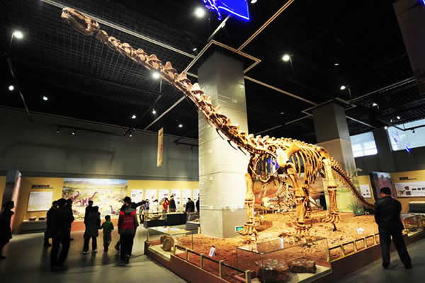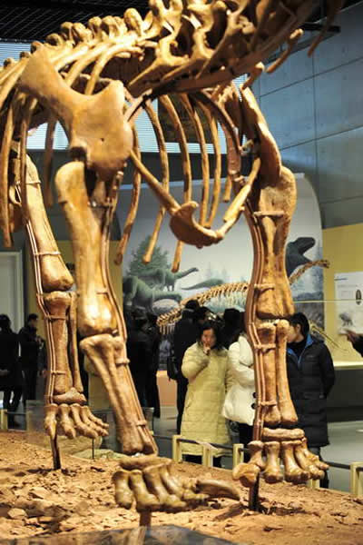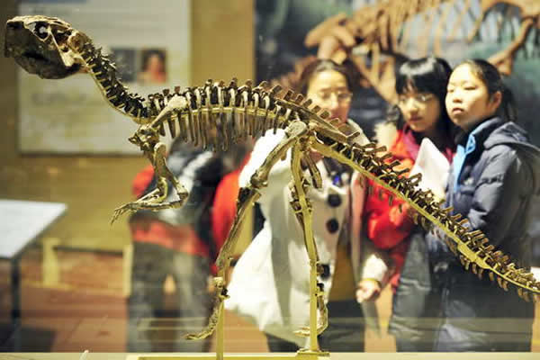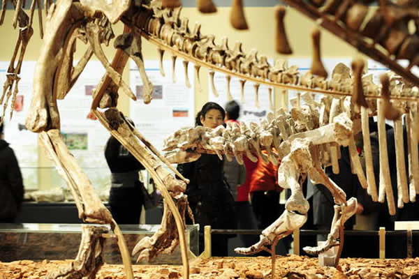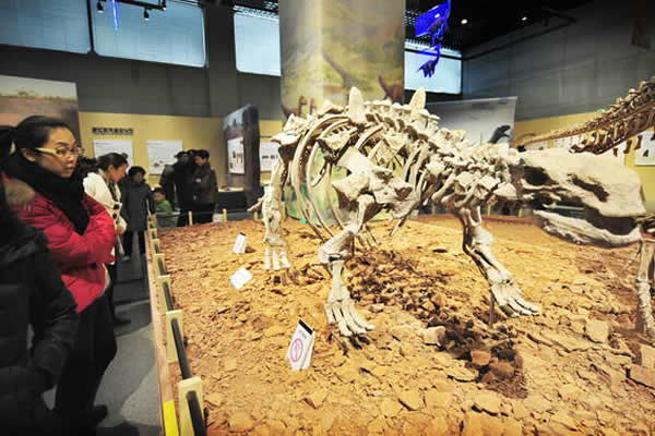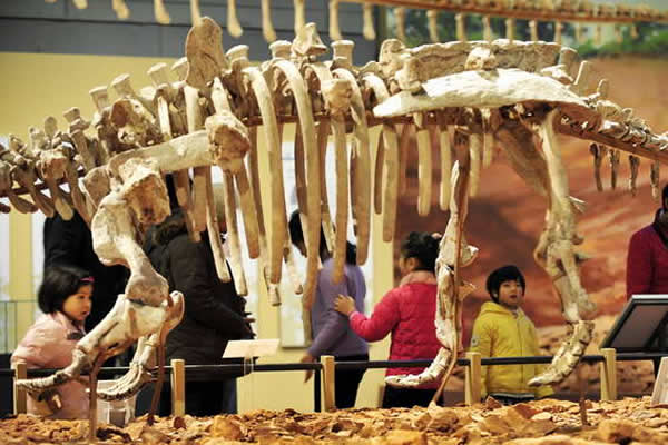 观众正在展厅里观赏浙江出土的恐龙骨架化石