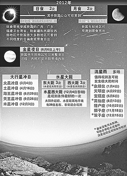2012年全球将有不少罕见天象出现。最值得关注的是金星凌日的重要天象。金星凌日是指金星运行到太阳和地球中间,从地球上看,金星就像太阳脸上一颗小圆黑痣,在6个半小时内缓慢穿越太阳的视圆面。北京时间2012年6月6日上午,能看到太阳的国家和地区都能欣赏到这一天象。发生下一次金星凌日是2117年12月11日,要等上100多年了。