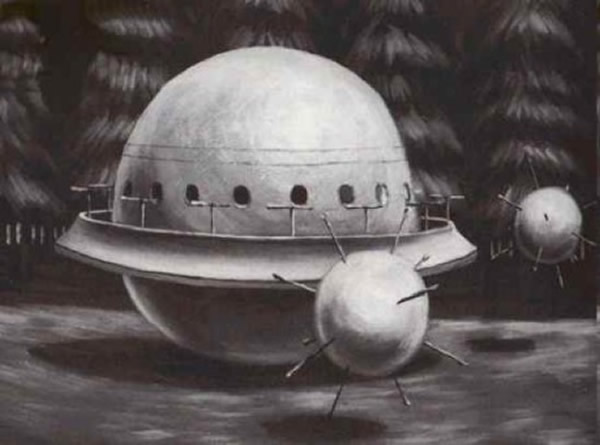 正当泰勒呆立不动之际,或许是对方发现了他,从飞船中飞出两个呈球形的小飞船并朝他飞来。其直径有0.5米~1米,与母船有同样的颜色与质感。突然从两个球体中伸出像脚似的长长的尖刺,球体用这个“脚”滚动,很快靠近泰勒。他听到两个球体在他身旁接触地面时发出爆裂的声响,并且还闻到像汽车刹车时因摩擦而散发的恶臭,令人窒息。这时泰勒感觉到两个球体各自拽拉他的裤腿,欲将自己掳往母船,他想顶住球体的吸力,结果失去意识倒在地上。