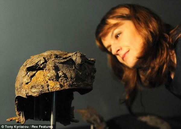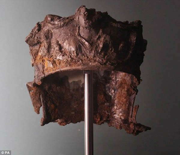 在大英博物馆,专家们用了3年时间将1000个小碎片拼接在一起,复原这个古罗马头盔及其颊革。头盔采用铁皮制成,一度装饰着金叶,是在英国发现的唯一一个古罗马镀银头盔,同时也是在英国发现的古代头盔中历史最为悠久的一个。