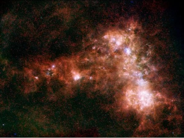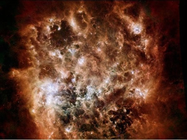 这是另一个斯皮策望远镜和赫歇尔太空天文台拍摄的照片,图中显示的是大麦哲伦星云。虽然它看上去有点儿像一个巨大的燃烧团,但当你真实观测时会发现从数百年光年之遥的星云中心存在灰尘涟漪流动。图中中偏左的最明亮区域是蜘蛛星云,其命名取决于可见光下的外形结构。