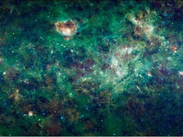 这张图片是由美国宇航局广域红外探测器(WISE)拍摄的,从图中我们看到银河系内存在着大量的星云,提示我们的太阳系是一个非常稳定的太空区域,系内邻近我们的许多恒星都处于诞生和死亡,这个星系处于骚动之中。