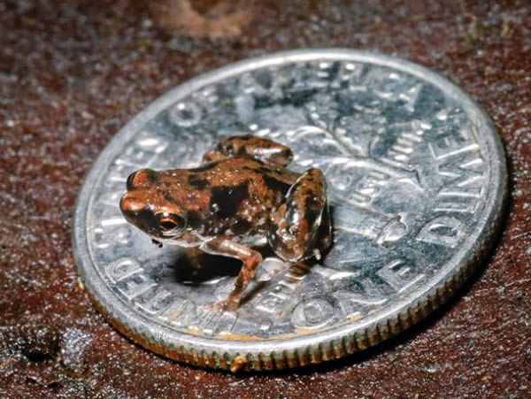据国家地理杂志网站报道,一项最新研究称,目前已知的世界最小脊椎动物是一只像家蝇那么大的蛙。最新发现的这种名叫Paedophryne amauensis的蛙,平均体长只有7.7毫米,比以前的最小脊椎动物世界纪录保持者——东南亚的印尼露比精灵灯(Paedocypris progenetica)鱼种稍微更小一些,后者雌性的体长大约只有7.9毫米。