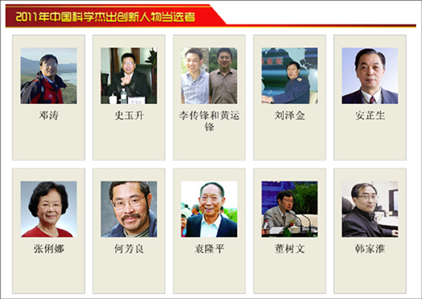 “2011中国科学年度人物评选”活动于2011年12月10日启动,旨在评选出公众心目中的2011年中国科学年度新闻人物及2011年中国科学杰出创新人物。历经40天征集及评选过程,上万名科教界专家、科技新闻工作者及网友参与推荐、投票。
