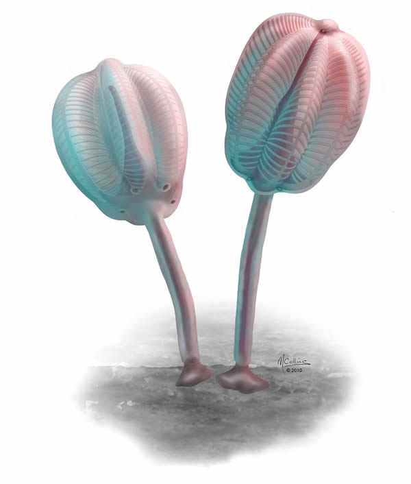 著名的加拿大布尔吉斯页岩中又有了新的发现,一种生活于5亿多年前的中寒武世“奇怪”生物慢慢浮现出它的样子。它被命名为Siphusauctum gregarium,是一类形状像郁金香的、长约为一支餐刀(约20厘米或8英寸)的生物,它拥有滤食性的取食器官。它由一枝长茎和萼部(一个“球茎状”结构)组成,萼部位于顶部,充当着滤食器与消化道。萼部的进水孔将水流吸入后,通过滤食,水中的食物颗粒便会被捕捉到,继而成为它的食物。茎部底有一个锚状结构使其固定在海底。它们通常群居而生,因此经常会在一块岩石上发现大量的化石标本。